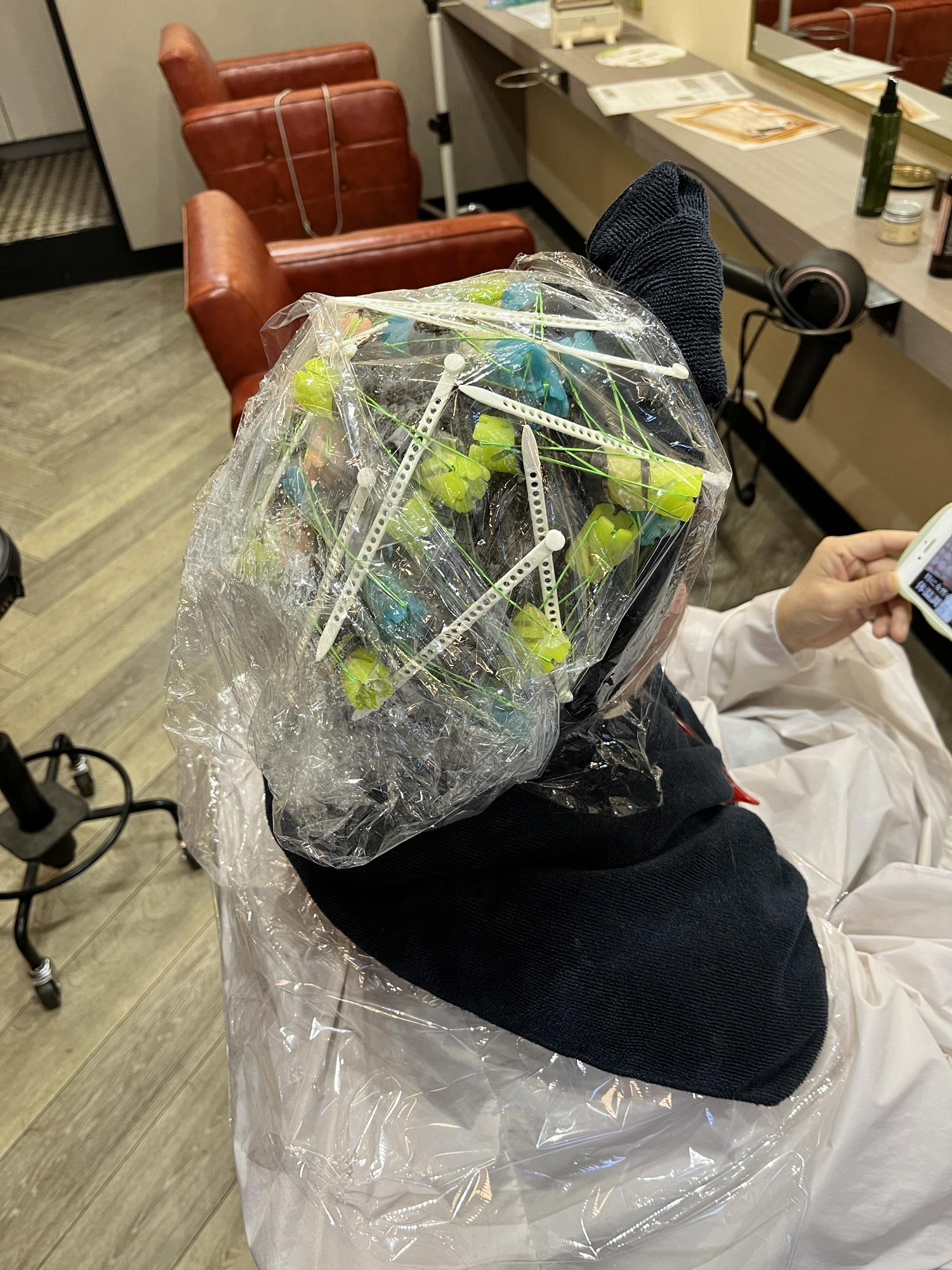 今回のスタイルは、アシンメトリーデザインをベースに、片側(ヘビーサイド)にボリュームと動きを与えるパーマを施しました。