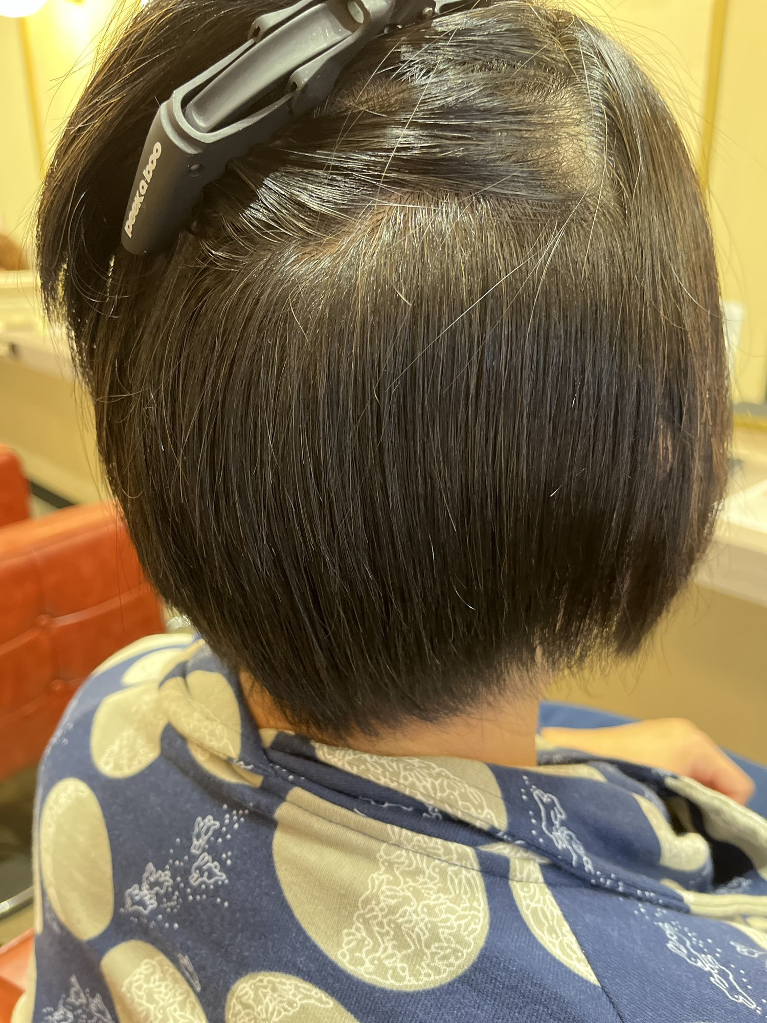 8日前にショートボブスタイルに縮毛矯正を施術されたゲストが、今回はカラーで再来店されました。